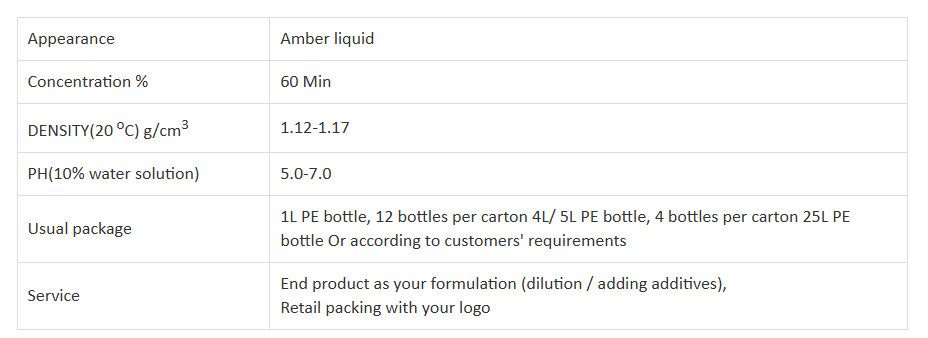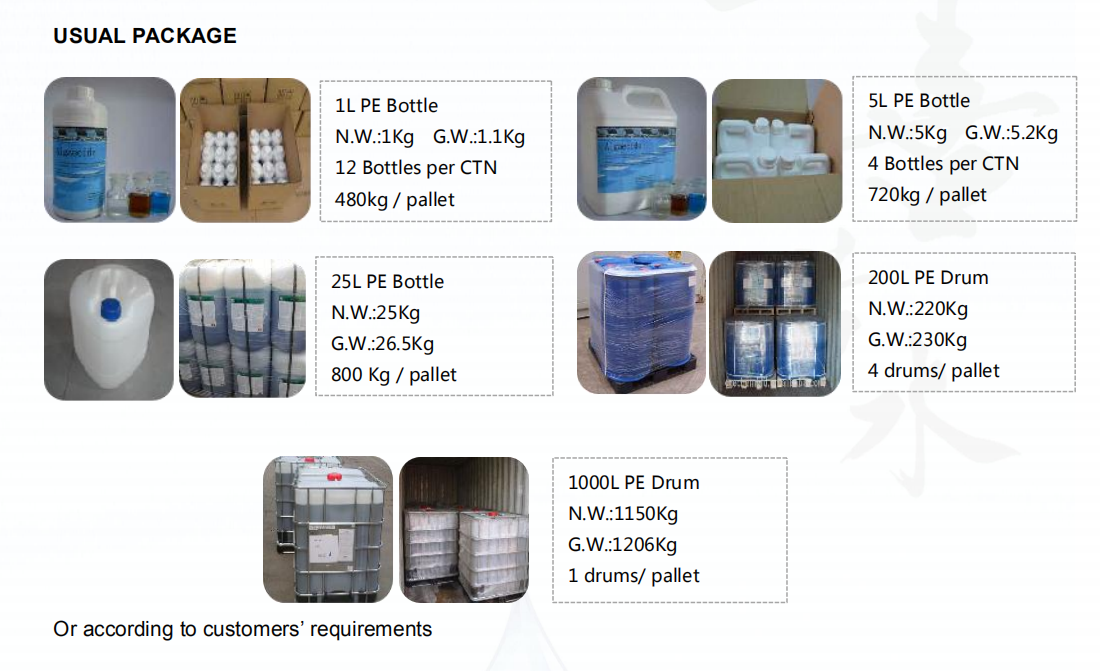 1L PE Bottle, 12/20 Bottles per Carton (Especially suit for reseller) 4L/ 5L PE Bottle 4 Bottles per Carton(Suit for final user) 25Kg net ON THE ROAD 220Kg net PE Drum (Usual packing on export) 1100Kg net IBC (Usual packing for export)